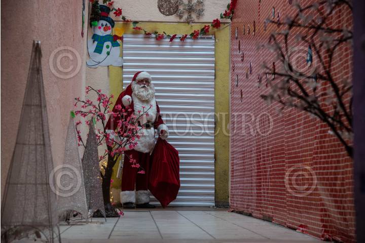 Una persona caracterizada de Santa Claus espera la llegada de personas en "Plaza MG", recientemente remodelada con motivo del Buen Fin y Temporada Decembrina-Reyes.