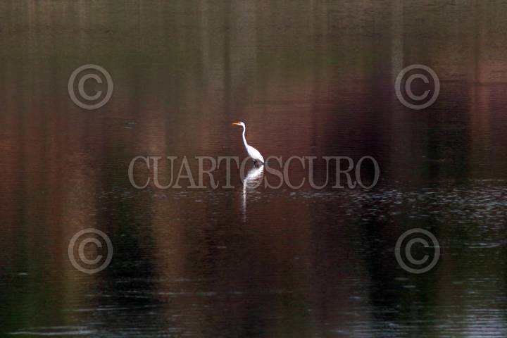 El reflejo alargado de una garza blanca en la presa Plan de Ayala, en Puente de Ixtla, Morelos.