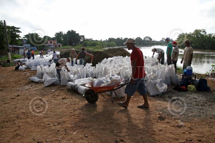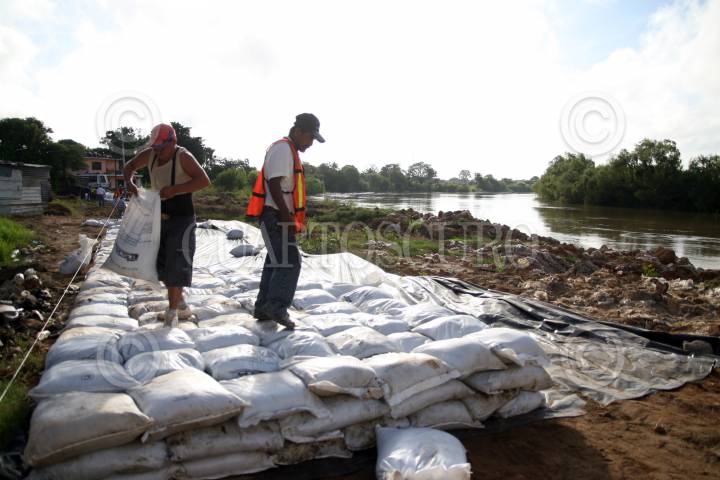 VILLAHERMOSA, TABASCO, 30SEPTIEMBRE2009.- Empleados temporales contratados por la CONAGUA realizan el amurallamiento con costales de arenas sobre el malecón Leandro Rovirosa de la colonia Gaviotas Sur. Sobre este sector el nivel del río Grijalva se torna peligroso ya que sus niveles de agua pueden rebasar su escala critica de un momento a otro. FOTO: MARCO POLO GUZMÁN HERNÁNDEZ/CUARTOSCURO.COM