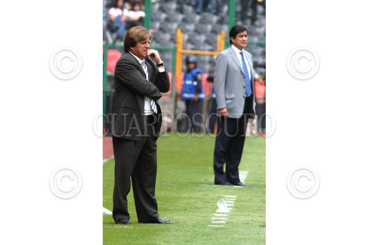 MÉXICO, D.F. 24SEPTIEMBRE2006.- Los directores técnicos Miguel Herrera (Monterrey) y Luis Fernando Tena (América) durante el partido de la jornada 10 del Torneo de Apertura 2006 en el que las águilas del América y los rayados del Monterrey empataron a un gol en el Estadio Azteca. FOTO: IVÁN STEPHENS/CUARTOSCURO.COM