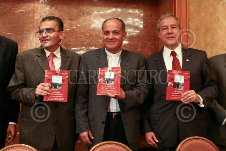 MÉXICO, D.F., 22MAYO2008.- José Antonio Ortega, el obispo José Antonio Muñoz y Fernando Guzman, al termino de la presentación del libro: "La verdad os hará libres; No tengan miedo; ¿Y el homicidio del cardenal Juan Jesús Posadas Ocampo?" FOTO: RODOLFO ANGULO/CUARTOSCURO.COM