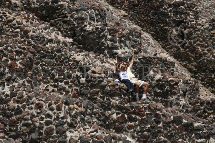TEOTIHUACÁN, ESTADO DE MÉXICO, 24ENERO2009.- En la pirámide de "El Sol" en la zona arqueológica de Teotihuacán, permanecen los agujeros que se hicieron para introducir los taquetes y tornillos para asegurar las luminarias que forman parte del proyecto multimedia "Resplandor Teotihucano". También quedan residuos los cuales serían desalojados según recomendación de diputados federales que hace unas semanas llevaron una inspección por el lugar. FOTO: MARIO NULO/CUARTOSCURO.COM
