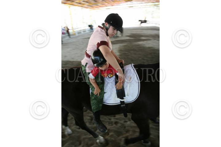 MÉXICO, D.F., 12AGOSTO201.-Policias de la Secretaria de Seguridad Pública adscritos al agrupamiento a caballo, trabajan ayudando a niños jóvenes y adultos con disfunciones motoras de origen neurológico y traumático a rehabilitarse a través de la Equinoterapia que se basa en, hipoterapias, monta terapéutica y ejercicios neuromusculares. Durante los últimos cuatro años se han beneficiado alrededor de 4 mil personas. FOTO: SAUL LOPEZ/CUARTOSCURO.COM
