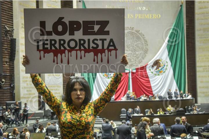CIUDAD DE MÉXICO, 10OCTUBRE2023.- María Teresa Castell, diputada del PAN, muestra una cartulina con frase "López Terrorista" durante la sesión ordinaria de la Cámara de Diputados en la que se presentó la efeméride con motivo FOTO: MARIO JASSO/CUARTOSCURO.COM