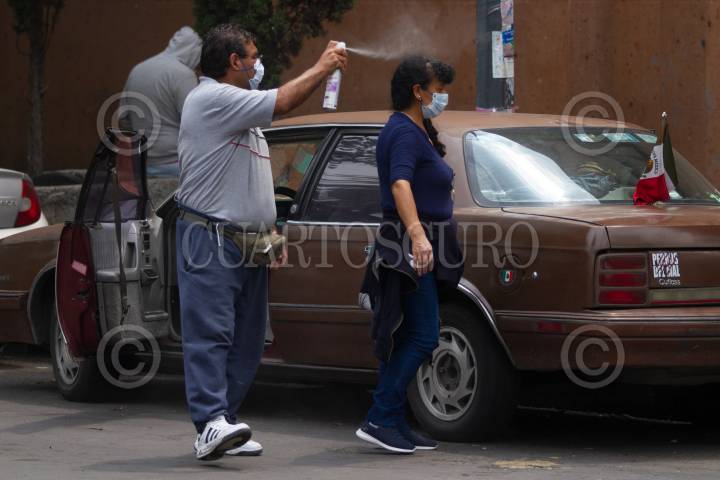 Un señor sanitiza a su pareja afuera del Hospital General Antonio de Mucha Macías