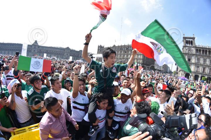 CIUDAD DE MÉXICO, 27JUNIO2018.- La Selección Mexicana perdió ante Suecia 3-0 en el mundial de fútbol de Rusia 2018, a pesar de la derrota el seleccionado paso en segundo lugar de su grupo con la combinación de resultados, ya que Alemania perdió ante Corea 2-0, sin embargo, los aficionados mexicanos celebraron el pase en el Zócalo. En la imagen los asistentes cargan en hombros a un turista coreano, ya que la victoria del seleccionado asiático permitió al tricolor pasar a la segunda fase de la justa mundialista. FOTO: TOÑO AGUILAR /CUARTOSCURO.COM