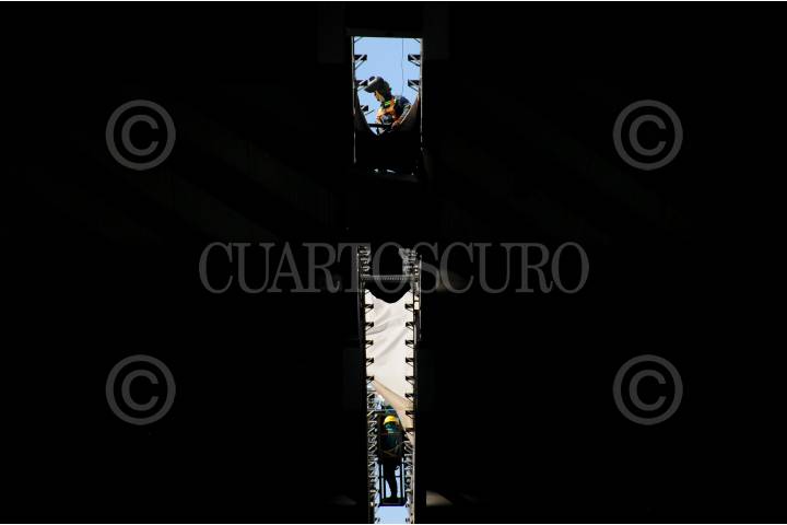 Dos hombres trabajan en el techo de la terminal DEL AIFA.