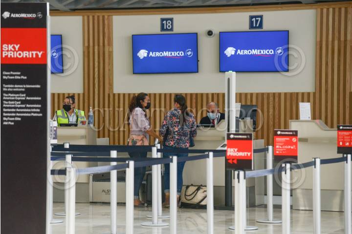 Dos mujeres solicitan información en el mostrador del Aeroméxico en el Aeropuerto Internacional Felipe Ángeles (AIFA).