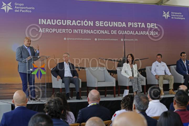 GUADALAJARA, JALISCO. 23JULIO2024.- Hoy el Aeropuerto Internacional de Guadalajara puso en operación su segunda pista, con el primer vuelo inaugural. Esta pista tiene una extensión de 3,538 metros de largo y 45 metros de ancho, de esta manera es el cuarto aeropuerto del país en tener una segunda pista, esta inversión es parte de los proyectos del Grupo Aeroportuario del Pacifico (GAP), del 2020-2024 y alcanzo la cifra de 15,900 millones de pesos. Además de la segunda pista, se modernizo la terminal 1, en aviación en general se construyo una nueva plataforma de 126, 090m2, 83 posiciones de aviones, cuatro para helicópteros, 45 hangares y nuevas instalaciones para autoridades gubernamentales. También se inauguro el edificio de usos múltiples, que incluye un hotel con 180 habitaciones ya en operación, dos edificios de oficinas, una plaza comercial con dos niveles entre otros servicios, la inauguración fue encabezada por el Gobernador del Estado Enrique Alfaro, entre otras personalidades. FOTO: FERNANDO CARRANZA GARCIA / CUARTOSCURO.COM