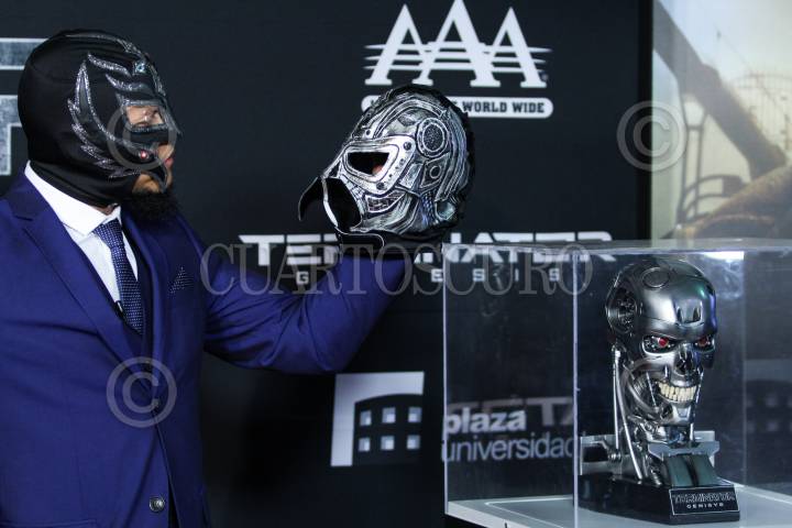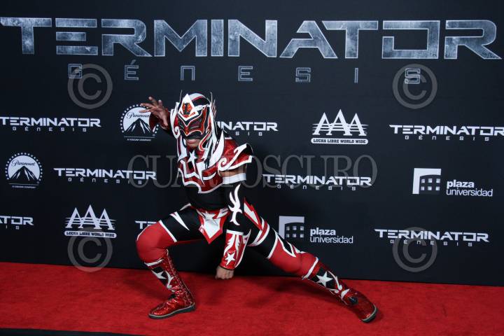 MÉXICO, D.F., 01JULIO2015.- Mascara Año Junior , luchador de la AAA durante la alfombra roja de Terminator Génesis. El luchador mexicano fue nombrado embajador latinoamericano de esta pelicula protagonizada por Arnold Schwarzenegger. FOTO: ISABEL MATEOS /CUARTOSCURO.COM