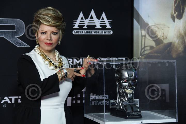 MÉXICO, D.F., 01JULIO2015.- Marcela Peña, presidenta de la AAA durante la alfombra roja de Terminator Génesis. El luchador mexicano fue nombrado embajador latinoamericano de esta pelicula protagonizada por Arnold Schwarzenegger. FOTO: ISABEL MATEOS /CUARTOSCURO.COM