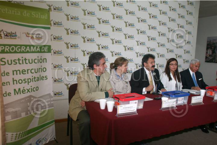 MÉXICO, D.F., 30OCTUBRE2009.- Fernando Bejarano, Director del Centro de Analisis y Acción en Tóxicos, Martha Delgado, Secretario de Salud, Armando Ahued, Secretario de Salud, Angelica Martinez Huitron, Directora de Servicios Hospitalarios y Carlos Javier Arnaiz, director del hospital pediátrico de Tacubaya, durante la conferencia de prensa de la sustitución de termómetros de mercurio en hospitales de la capital. FOTO: SAÚL LÓPEZ/CUARTOSCURO.COM