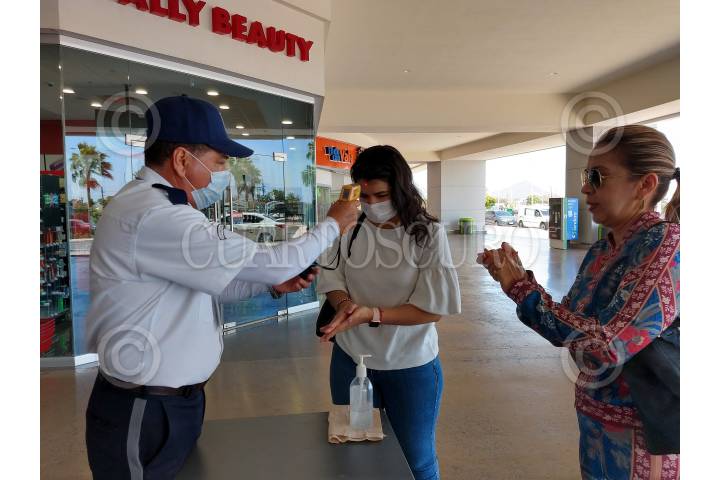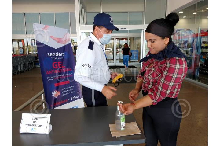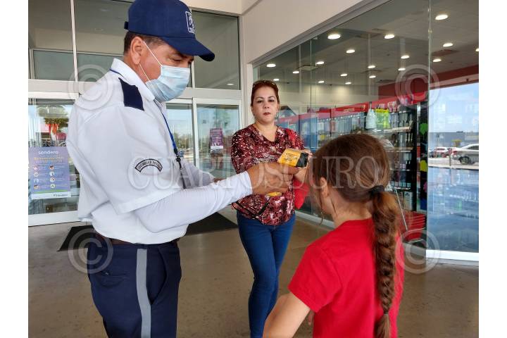 En Centro Comerciales trabajadores de seguridad les miden la temperatura a los clientes como una medida preventiva para detectar posibles casos de Covid-19
