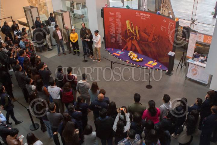 CIUDAD DE MÉXICO, 26OCTUBRE2017.- Se llevó a cabo la inauguración del altar en memoria a las víctimas de los sismos del 7 y 19 de septiembre ocurridos en Chiapas, Oaxaca y Ciudad de México, respectivamente. Además se llevó acabo un recital de poesía que realizó el escritor y periodista Juan Villoro, acompañado por la curadora e historiadora del arte, Linda Atach; el pintor y escultor Edgar Flores mejor conocido como "Saner" y Luz Álvarez, miembro del grupo de rescatistas Topos. El evento fue organizado en el museo Memoria y Tolerancia. Durante el evento, trabajadores del museo alzaron sus puños en señal de homenaje a las víctimas y rescatistas. FOTO: TERCERO DÍAZ /CUARTOSCURO.COM