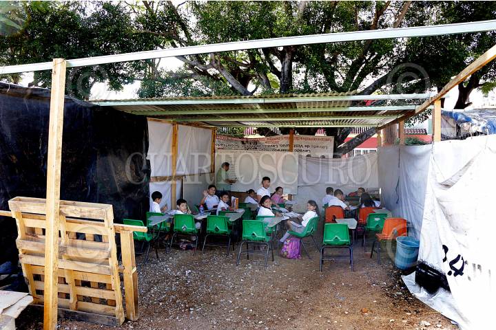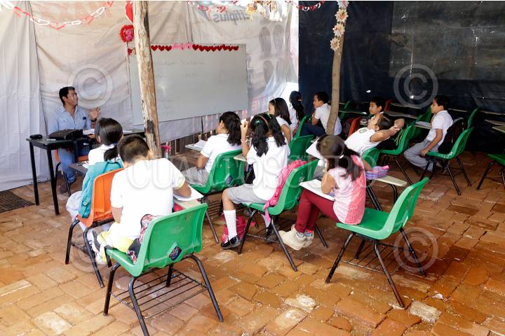 TUXTLA GUTIERREZ, CHIAPAS, 15FEBRERO2018.- Directivos y Padres de Familia de la Escuela Primaria Jaime Torres Bodet, denunciaron la mañana de este jueves de no recibir el apoyo necesario para restaurar las instalaciones tras el pasado terremoto del 7 de septiembre. Los padres edificaron aulas temporales con materiales reciclados para que los niños puedan seguir recibiendo clases, pero denuncian que las condiciones son deplorables para los infantes. FOTO. JACOB GARCÍA /CUARTOSCURO.COM