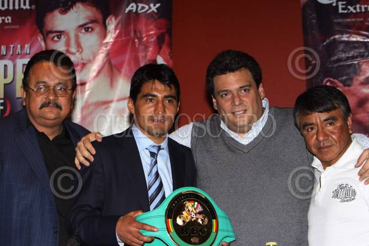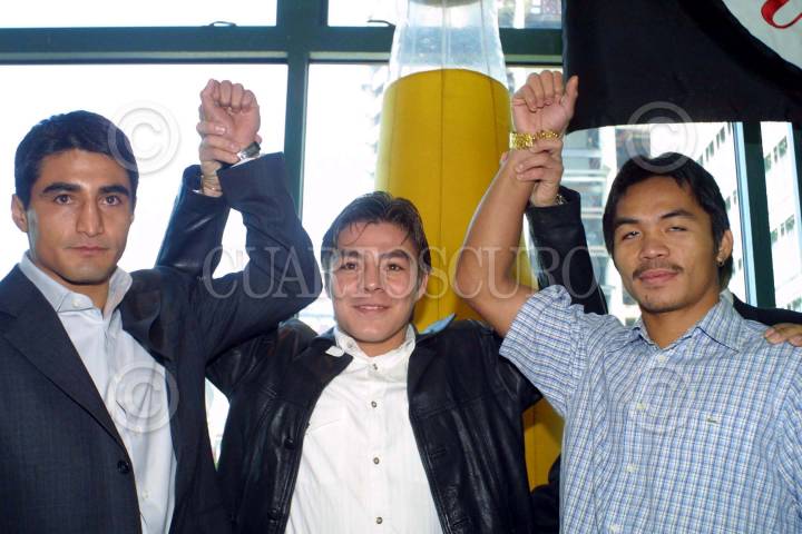 MEXICO, D.F. 19ENERO2005.- El boxeador mexicano Erick "El Terrible" Morales se enfrentará a el filipino Manny Pacquiaom, en la pelea pactada el 19 de Marzo en el MGM de las Vegas. En la gráfica los acompaña José Sulaiman, presidente del Consejo Mundial de Boxeo. FOTO: Anastasia Elizarrarás/CUARTOSCURO.COM