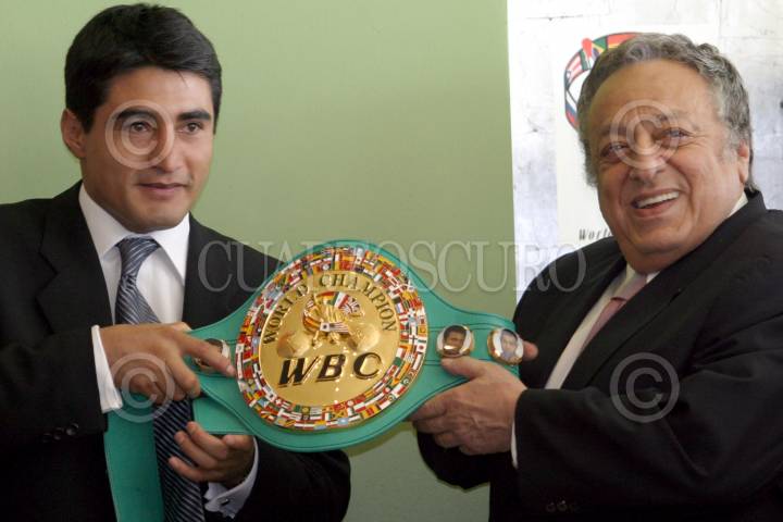 México, D. F. 27 Abril 2004.- Erik el terrible Morales, de 28 años y con un palmarés de 46 triunfos y una derrota, recibió un cinturón especial del CMB y fue proclamado "campeón para siempre" por el presidente del organismo, el mexicano José Sulaimán, en una ceremonia celebrada en la capital mexicana. FOTO: Nelly Salas/CUARTOSCURO.COM