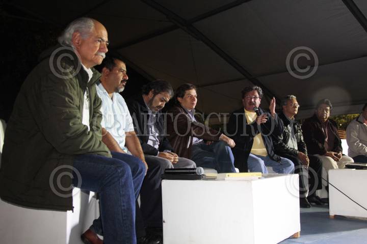 MÉXICO, D.F., 30OCTUBRE2012.- Paco Ignacio Taibo II, acompañado de Gilberto Ensastiga, Humberto Montes de Oca, Roberto Rico, Manuel Oropeza y Francisco Pérez Arce, durante el foro “Tertulias, A Donde Va la Izquierda” realizado en la explanada de la delegación Coyoacán FOTO: SAÚL LÓPEZ /CUARTOSCURO.COM