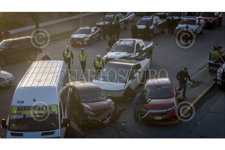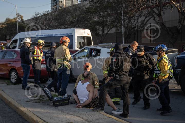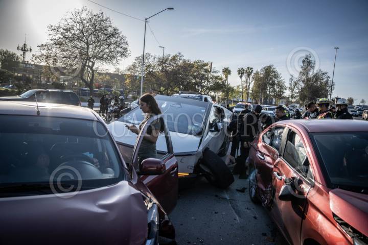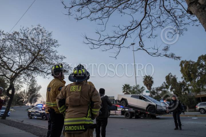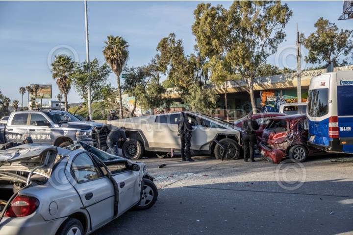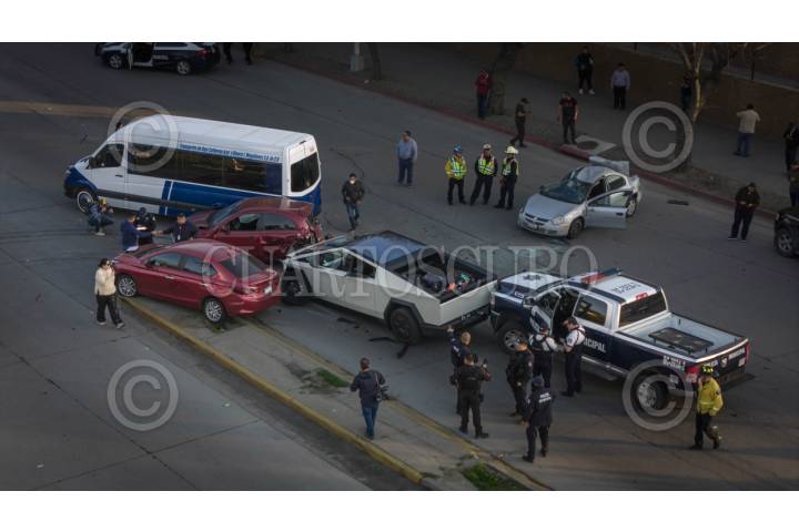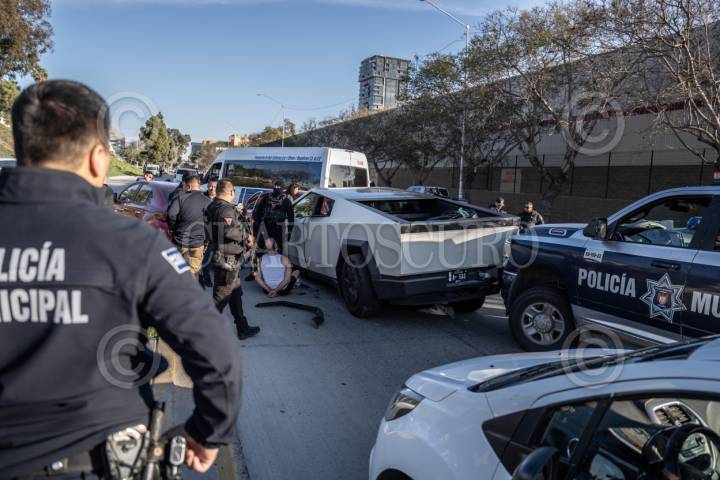 TIJUANA BAJA CALIFORNIA 20MARZO2025.-Una persecución protagonizada por un hombre de la tercera edad a bordo de un Tesla Cybertruck terminó en una carambola con alrededor de seis vehículos involucrados, entre ellos un transporte público. De acuerdo con información extraoficial, los hechos ocurrieron la tarde del jueves cuando el conductor del Tesla fue detenido por autoridades en la Zona Centro por una infracción de tránsito. Al llegar la grúa, el hombre emprendió la huida, lo que desató la persecución. Sobre el bulevar Paseo de los Héroes, a la altura del Costco de la Zona Río, el Tesla terminó impactándose contra varios vehículos, los cuales a su vez colisionaron entre sí. Los autos involucrados fueron: una unidad transporte público, un Honda, un Nissan March, un Neón y una Ford Escape. Como resultado, cuatro personas resultaron lesionadas: dos hombres y dos mujeres, quienes fueron atendidos por paramédicos en el lugar.Algunos de los conductores afectados comentaron que vieron al Tesla venir a alta velocidad, pero no esperaban que los impactara. "Cuando menos pensamos, ya era una carambola", señalaron. Agentes de la Policía Municipal lograron detener al hombre de la tercera edad, quien se identificó como veterano y se presume que estaba bajo los efectos de sustancias prohibidas. FOTO: OMAR MARTÍNEZ/ CUARTOSCURO.COM