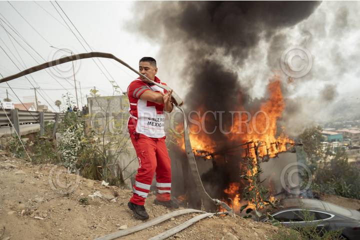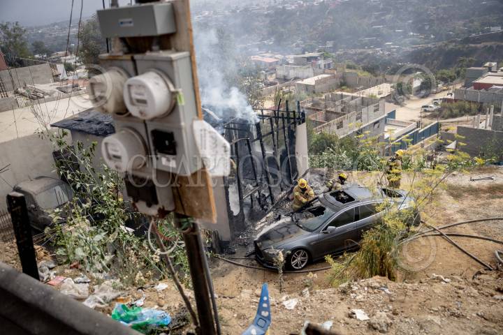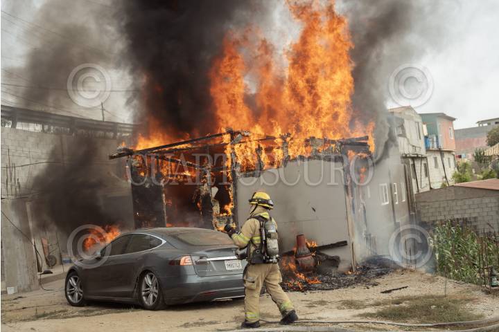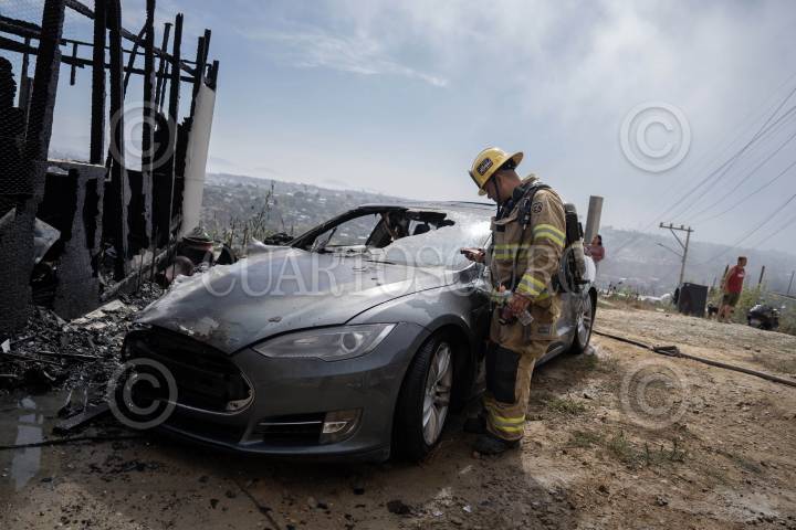TIJUANA BAJA CALIFORNIA, 05AGOSTO2024.-Un auto Tesla, que estaba conectado al poste de la luz, y una vivienda se incendiaron esta mañana en la colonia Lázaro Cárdenas. “Es algo inusual que nos toca por primera vez un vehículo Tesla incendiado”, declaró Arturo Sánchez , supervisor de bomberos que atendió el reporte. Detalló que los bomberos de Tijuana se han capacitado sobre los automóviles eléctricos, porque en caso de un incendio, tardan más en poder sofocarse, como el ocurrido hoy en Tijuana. “Son vehículos que representan un gran reto para bomberos, sobre todo por el riesgo y por la gran cantidad de agua que se va a utilizar para sofocar un vehículo de estos y agreguémosle a este Tesla que está conectado directamente a la corriente del cable”, agregó. El bombero afirmó que, como coloquialmente se conoce, realizaron una “chicanada” para conectar el auto a la corriente eléctrica para cargarlo. El incendio se registró minutos después de las 9:00 a.m. de este lunes en dicha colonia, entre las calles Emiliano Zapata y Lázaro Cárdenas. FOTO: OMAR MARTÍNEZ/CUARTOSCURO.COM