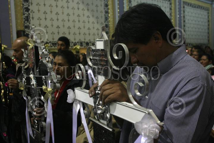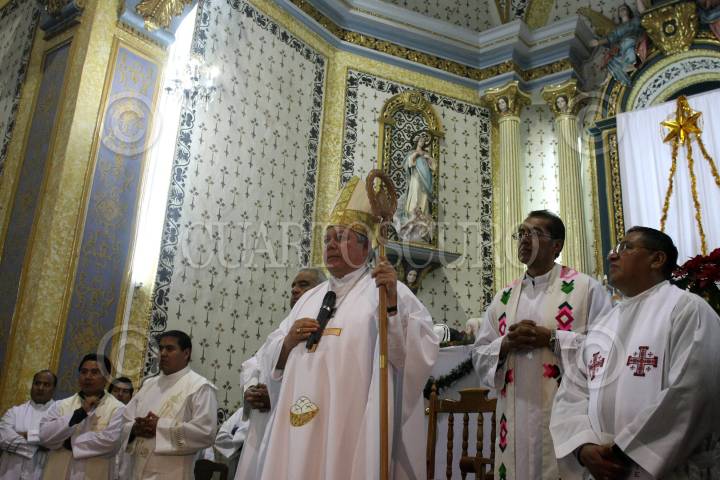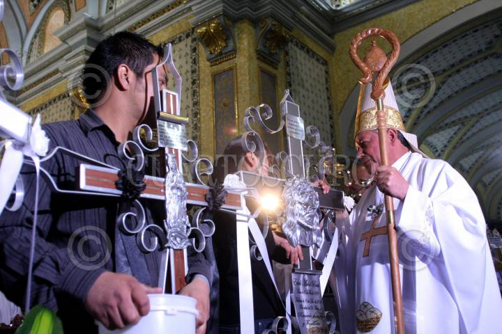 SAN MARTÍN TEXMELUCAN, PUEBLA, 29DICIEMBRE2010.- El arzobispo de Puebla, Victor Sánchez Espinosa, ofició la misa de 9 días y levantamiento de cruz de las 29 personas que fallecieron en la explosión del ducto de PEMEX el pasado domingo 19 de diciembre. La ceremonia eucarística tuvo lugar en la capilla de San Martín, ubicada en la zona centro de la ciudad. FOTO: FRANCISCO GUASCO/CUARTOSCURO.COM