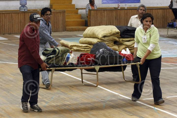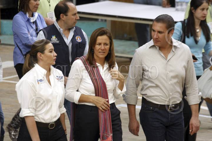 PUEBLA, PUEBLA, 26JUNIO2012.- Margarita Zavala, Presidenta Nacional de DIF acompañada por el gobernador de Puebla, Rafael Moreno Valle y su esposa Martha Erika Alonso, visitaron el albergue que se instaló en San Martín Texmelucan tras el desbordamiento del río Atoyac. FOTO: HILDA RÍOS /CUARTOSCURO.COM