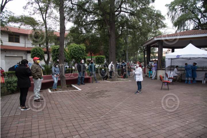 Personas esperan en la fila para poder realizarse la prueba PCR para covid-19 en el "Kiosco de Salud Covid-19" ubicado en la glorieta de los Ahuehuetes.