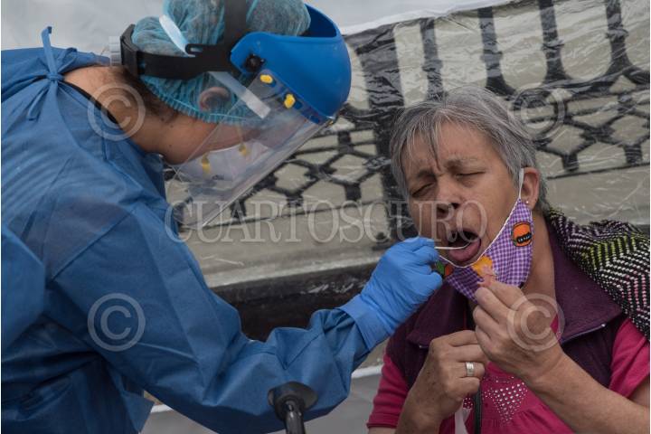 Una mujer de la tercera de edad se realiza la prueba PCR para covid-19 en el "Kiosco de Salud Covid-19" ubicado en la glorieta de los Ahuehuetes.