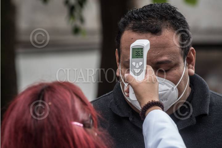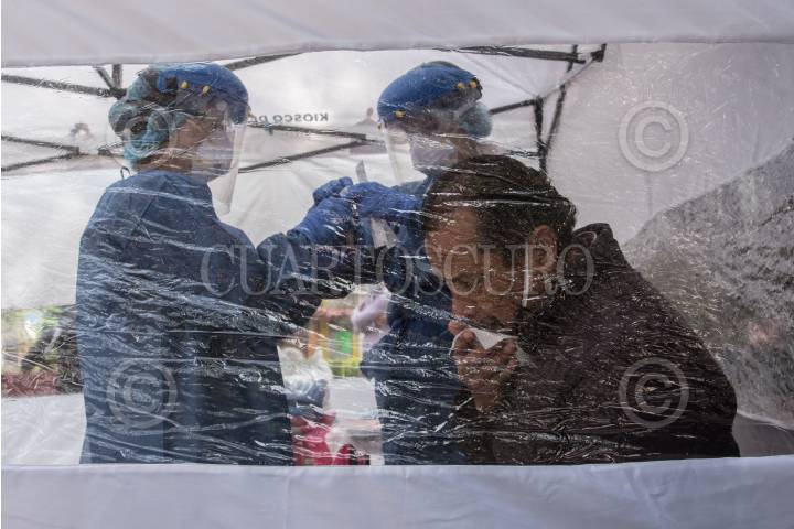 Una doctora toma la temperatura de un hombre previo a que se realice la prueba PCR para covid-19 en el "Kiosco de Salud Covid-19" ubicado en la glorieta de los Ahuehuetes.