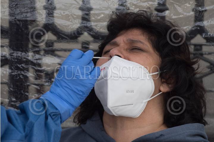 Una mujer se realiza la prueba PCR para covid-19 en el "Kiosco de Salud Covid-19" ubicado en la glorieta de los Ahuehuetes.