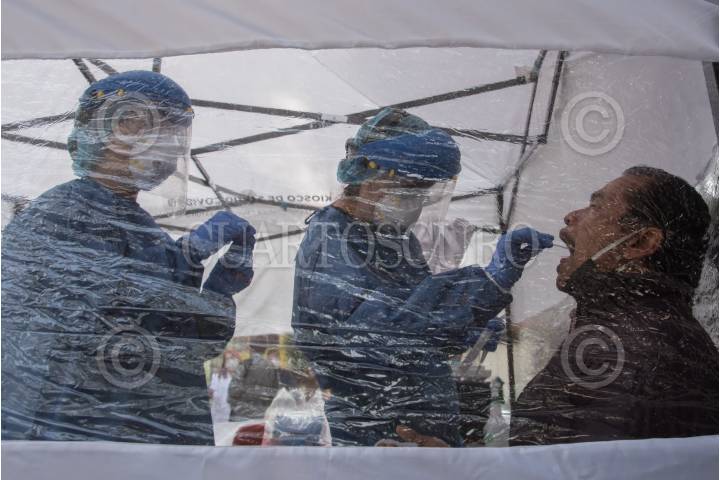 Un hombre se realiza la prueba PCR para covid-19 en el "Kiosco de Salud Covid-19" ubicado en la glorieta de los Ahuehuetes.