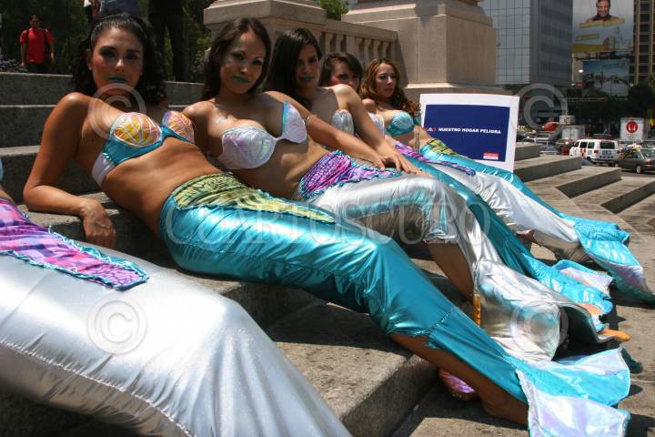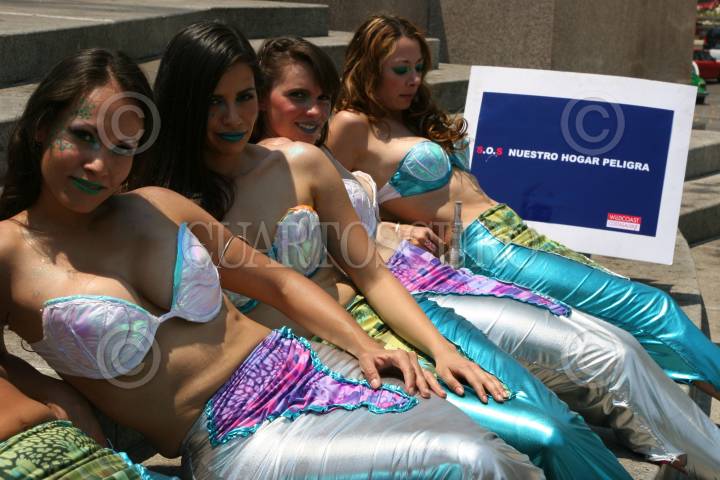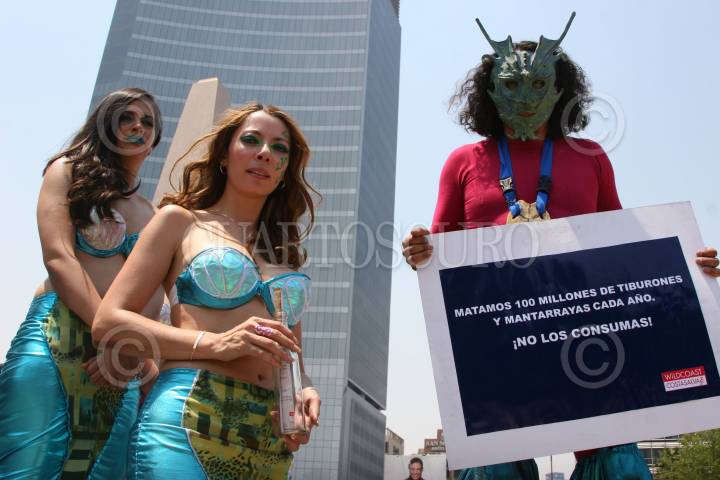 MÉXICO D.F., 31MARZO2009.- Activistas del grupo "WILDCOAST/COSTASALVAJE" vestidas de sirenas se manifestaron sobre Paseo de la Reforma, para pedir a las autoridades correspondientes, tomen acciones para proteger mas especies de tiburones, ya que según ellos las flotas de barcos atuneros arrasan con la vida marina. FOTO: RICARDO CASTELAN/CUARTOSCURO.COM
