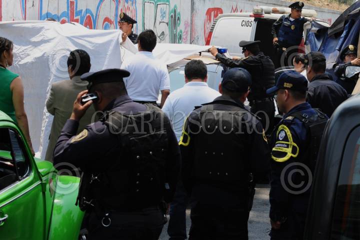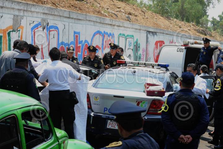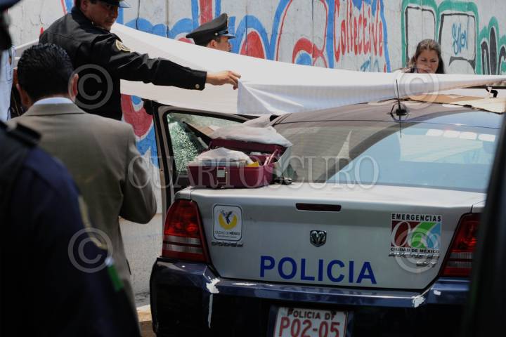 MÈXICO D.F. 06MAYO2013. Un elemento de la policía capitalina, decidiò quitarse la vida dándose un disparo en la cabeza a bordo de su patrulla P-02-05 del sector Ticoman, luego de estacionarse sobre Perifèrico casi esquina con Acueducto de Guadalupe colonia del mismo nombre. Se desconocen las causas que lo orillaron a tomar esta decisión. Peritos de este sector y elementos periciales de la Gustavo A. Madero acudieron al lugar en donde impidieron a toda costa la labor informativa de los reporteros. FOTO: LUIS CARBAYO /CUARTOSCURO.COM