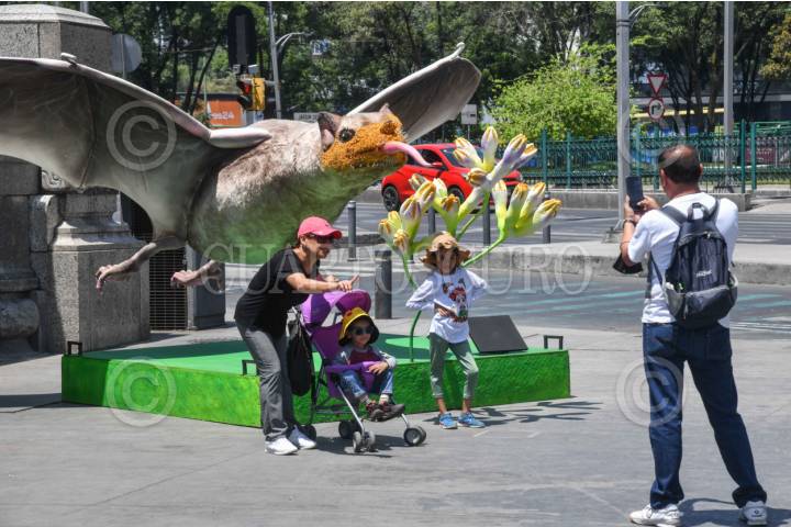 CIUDAD DE MÉXICO, 26MARZO2024.- Personas acuden al zoológico del Bosque de Chapultepec para disfrutar de las vacaciones de Semana Santa. En la imagen, una familia se toman una fotografía junto a una figura de un murciélago que forma parte de la muestra "Quiróptera” del Festival del Bosque de Chapultepec. FOTO: MARIO JASSO /CUARTOSCURO.COM