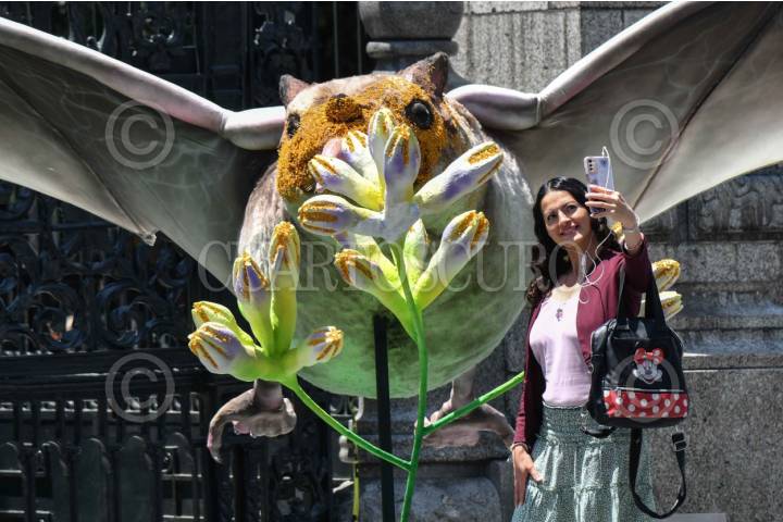 CIUDAD DE MÉXICO, 26MARZO2024.- Personas acuden al zoológico del Bosque de Chapultepec para disfrutar de las vacaciones de Semana Santa. En la imagen, una mujer se toma una fotografía junto a una figura de un murciélago que forma parte de la muestra "Quiróptera” del Festival del Bosque de Chapultepec. FOTO: MARIO JASSO /CUARTOSCURO.COM