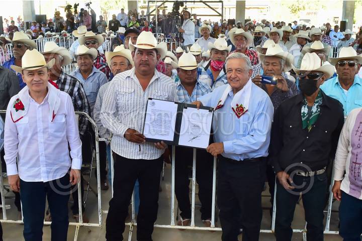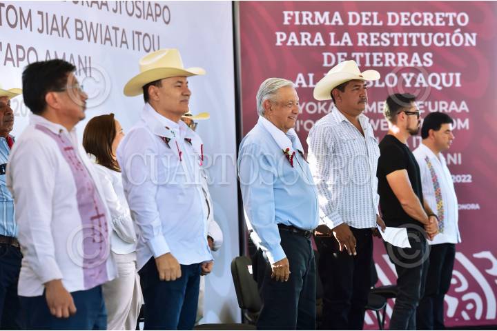 Adelfo Regino, Alfonso Durazo, Andrés Manuel López Obrador, José Ricardo Jaimes Valenzuela, Román Meyer Falcón y Jesús Ramírez Cuevas, durante la Firma del Decreto para la Restitución de Tierras al Pueblo Yaqui en Guaymas, Sonora.