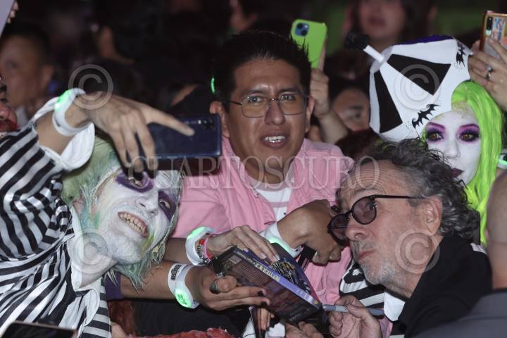 NAUCALPAN, ESTADO DE MÉXICO, 14AGOSTO2024. El director Tim Burton se toma fotos con fans durante el Fan Event y alfombra blanco y negro de la película “Beetlejuice, Beetlejuice”, en su gira de promoción mundial, previo a su estreno en cines. FOTO: EDGAR NEGRETE LIRA/CUARTOSCURO.COM
