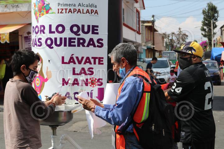 En los tianguis de la alcaldía Iztapalapa se colocaron medidas sanitarias para que los capitalinos se laven las manos, usen gel antibacterial y procuren entrar sólo una persona por familia