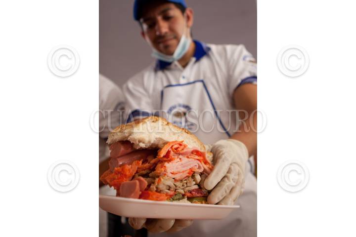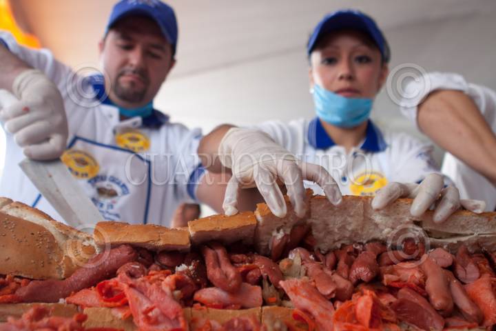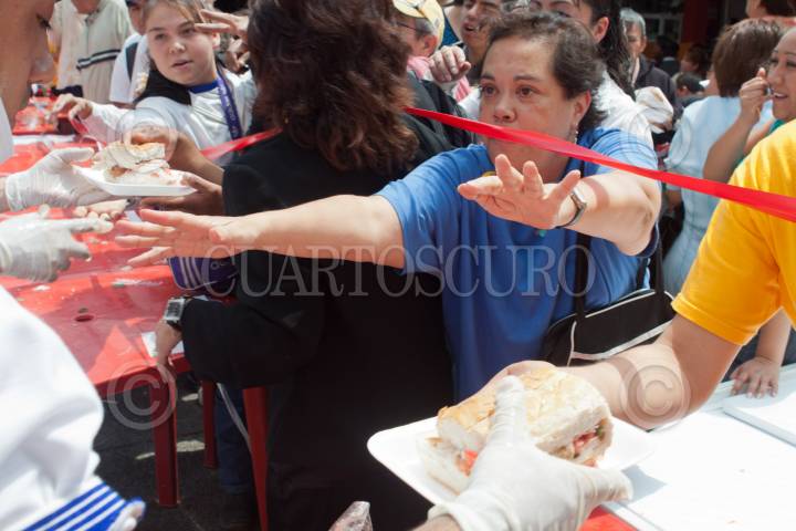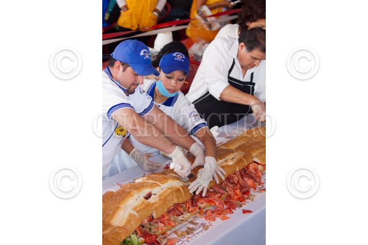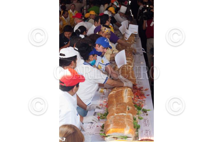 MÉXICO, D.F., 27JULIO2011.- Torteros de la delegación Venustiano Carranza prepararon la torta más grande mundo la cual midió 50 metros en solo unos minutos. Este alimento típico fue elaborado con diferentes ingredientes y repartida en aproximadamente 15 minutos, esto como parte de las actividades de la inauguración de la 8va Feria de la Torta que se celebra en el explanada de la delegación mencionada. FOTO: MOISÉS PABLO/CUARTOSCURO.COM