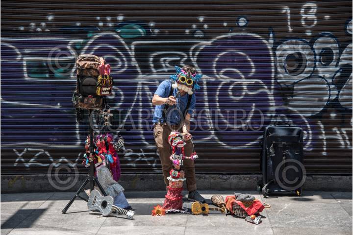 CIUDAD DE MÉXICO, 28JULIO2018.- Un jóven titiritero realiza un espectáculo sobre la avenida 16 de septiembre en el centro histórico para poder ganarse unas monedas. FOTO: MARIO JASSO /CUARTOSCURO.COM