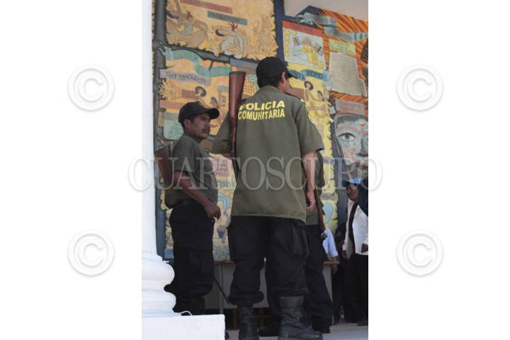 TLAPA DE COMONFORT, GUERRERO, 19FEBRERO2013.- Armados con viejos fusiles y enfundados en uniformes que los identidfican como Policias Comunitarios pertenecientes a la comunidad de San Miguelito, en este municipio de la Montaña guerrerense asistieron a entrevistarse con el alcalde de este municipio Victoriano Wences Real procedente del PT, con la finalidad de gestionar apoyos, dentro de los que solicitan más armas, municiones o dotación de gasolina para poder realizar sus patrullajes por esta zona en la que se ha incrementado la actividad del crimen organizado como secuestros, asaltos y extorsiones. Al fondo se observan fragmentos de la pintura mural que decora la fachada de la sede de la alcaldía mencionada, en la que se cuenta la historia prehispánica de los indígenas tlapanecos y mixtecos que habitan esta región. FOTO: J GUADALUPE PÉREZ/CUARTOSCURO.COM