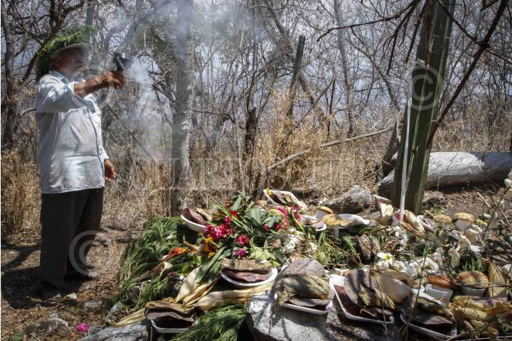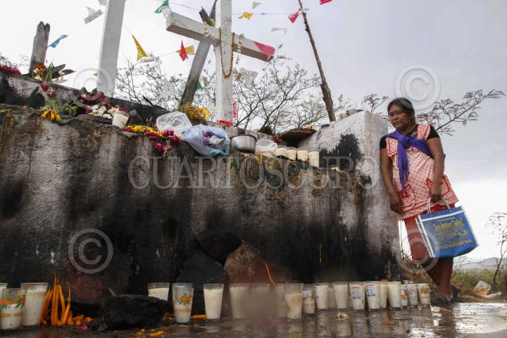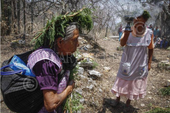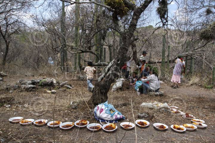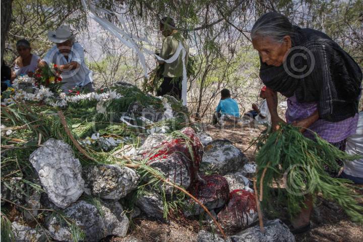 TLAPA DE COMONFORT, GUERRERO, 27ABRIL2014.- El ritual de petición de lluvia de San Pedro Petlacala, Guerrero se hace en San Pedro Petlacala; una pequeña comunidad Nahua escondida en la sierra de Guerrero, región al norte del estado conocida como La Montaña. Año con año, en la comunidad se realiza el ritual conocido como “Petición de Lluvia” dedicada a los festejos de San Marcos. El santo protector de la comunidad y aquel que se encarga de recibir los dones para garantizar buenas lluvias en la temporada húmeda, desde junio hacia octubre, que garantizan el buen crecimiento de las plantas del maíz. El ritual es muy antiguo, se desconoce desde cuanto tiempo se celebra. Desde la madrugada del 25 de abril muchos habitantes comunitarios suben a un cerro llamado “Petlacaltepetl” en las cercanías del pueblo donde se encuentra un santuario y una cruz dedicada a San Marcos. En este sitio, durante todo el día, se componen ofrendas en comidas, se encienden velas, y se sacrifican varios animales en honor al santo. Según una lógica llamada por la comunidad científicas del “don y el contra don” los animales y las ofrendas tienen el propósito de agradecer al santo y pedir en cambio un año de buen auspicio. FOTO: BERNANDINO HERNANDEZ /CUARTOSCURO.COM