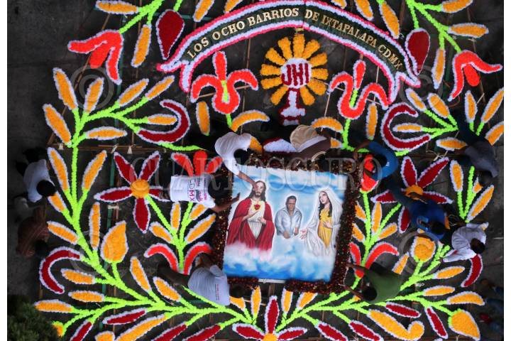 CUERNAVACA, MORELOS, 07SEPTIEMBRE2017.-Del 1 al 10 de septiembre se lleva a cabo la edición número 297 de la feria de Tlaltenango, se espera el arribo de más de 45 peregrinaciones de Morelos y estado vecinos que veneraran a la Virgen de los Milagros. Solo los hombres de una peregrinación de Iztapalapa “florean” (tejen con flores) la fachada como parte de un milagro realizado por esta virgen. FOTO: MARGARITO PÉREZ RETANA /CUARTOSCURO.COM