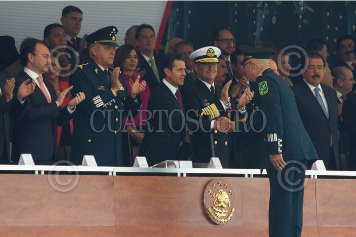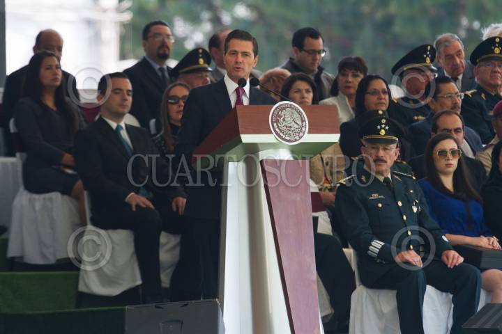 CIUDAD DE MÉXICO, 20NOVIEMBRE2018.- Enrique Peña Nieto, Presidente de México, encabezó la ceremonia del 108 aniversario de la Revolución Mexicana, realizado en Campo Marte. A su derecha en la imagen el General José Luis Sánchez León quien fue ascendido a General de División por parte del Jefe del Ejecutivo, el fue responsable del operativo de Tlatlaya, Estado de México, en donde murieron 22 personas. FOTO: MOISÉS PABLO /CUARTOSCURO.COM