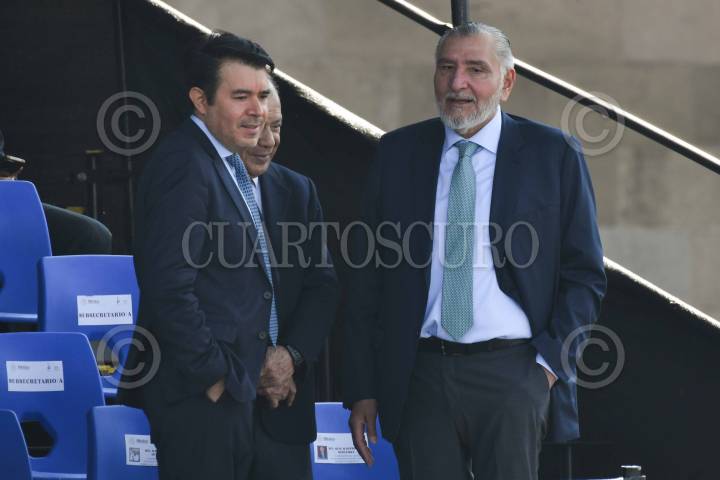 CIUDAD DE MÉXICO, 28FEBRERO2025.- Félix Arturo Medina, subsecretario de Derechos Humanos, Población y Migración, y Adán Augusto López, senador de Morena, durante el Homenaje "Funerales de Estado en Conmemoración de los 500 años de la Ejecución de Cuauhtémoc", realizado en el zócalo capitalino. FOTO: MARIO JASSO/CUARTOSCURO.COM