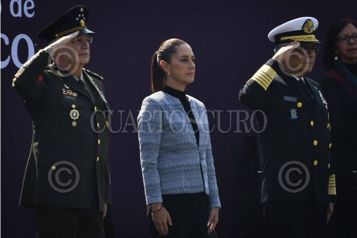 CIUDAD DE MÉXICO, 28FEBRERO2025.- Claudia Sheinbaum, presidenta de México, durante el homenaje "Funerales de Estado en Conmemoración de los 500 años de la Ejecución de Cuauhtémoc", realizado en el zócalo capitalino. La acompañan: Ricardo Trevilla Trejo, secretario de la Defensa Nacional; Raymundo Pedro Morales, secretario de Marina; Sergio Gutiérrez, presidente de la mesa directiva de la Cámara de Diputados, y Rosa Icela Rodríguez, secretaria de Gobernación. FOTO: MARIO JASSO/CUARTOSCURO.COM