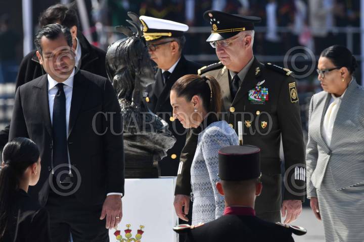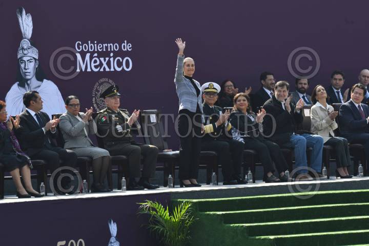 CIUDAD DE MÉXICO, 28FEBRERO2025.- Claudia Sheinbaum Pardo, presidenta de México, en compañía de la jefa de gobierno Clara Brugada; Ricardo Trevilla Trejo, secretario de la Defensa Nacional; Sergio Gutiérrez Luna, presidente de la Cámara de Diputados; Rosa Icela Rodríguez, secretaria de Gobernación; Raymundo Pedro Morales, secretario e Marina, y Gerardo Fernández Noroña, presidente del Senado, encabezaron la guardia de honro durante la ceremonia de “Funerales de Estado en Conmemoración de los 500 años de la Ejecución de Cuauhtémoc” en las inmediaciones del Zócalo capitalino. FOTO: GALO CAÑAS/CUARTOSCURO.COM
