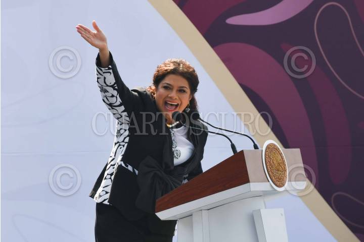 CIUDAD DE MÉXICO, 28FEBRERO2025.- Clara Brugada, jefa de Gobierno, durante el homenaje "Funerales de Estado en Conmemoración de los 500 años de la Ejecución de Cuauhtémoc", realizado en el zócalo capitalino. FOTO: MARIO JASSO/CUARTOSCURO.COM