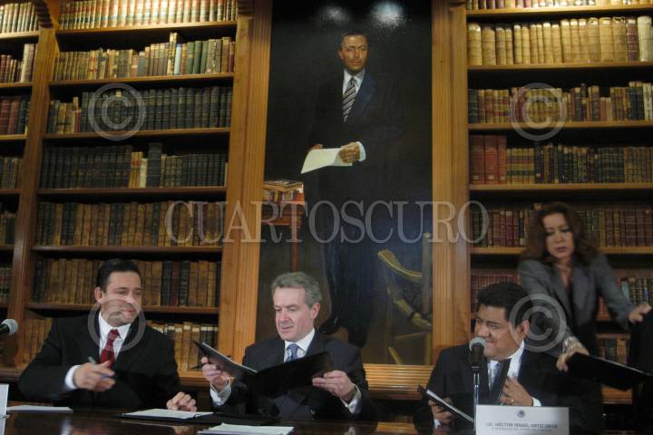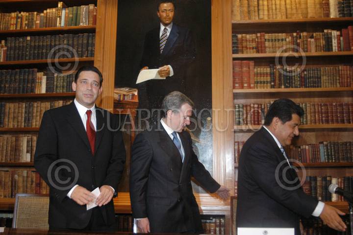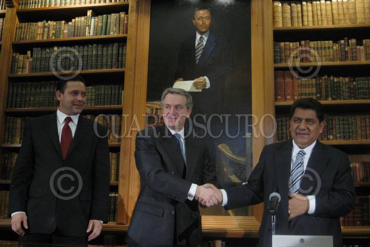 MEXICO D.F. 26MAYO2005.- En la bibloteca de la SEGOB, se realizo la ceremonia de la firma de convenio en materia de seguridad. Eugenio Javier Hernández, gobernador de Tamaulipas , Santiago Creel, secretario de Gobernación y el mandatario tlaxcalteca Héctor Israel Ortiz. FOTO: Germàn Romero/CUARTOSCURO.COM