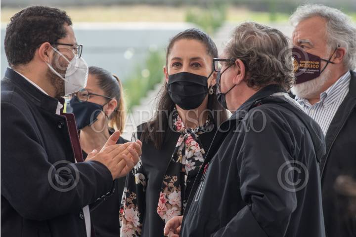 Claudia Sheinbaum, jefa de Gobierno capitalino; Martí Batres, secretario de gobierno de la Ciudad de México; Paco Ignacio Taibo II, director del Fondo de Cultura Económica, y Alejandro Encinas, subsecretario de Derechos Humanos, Población y Migración, durante la presentación del Proyecto "Tlaxcoaque: Sitio de Memoria".